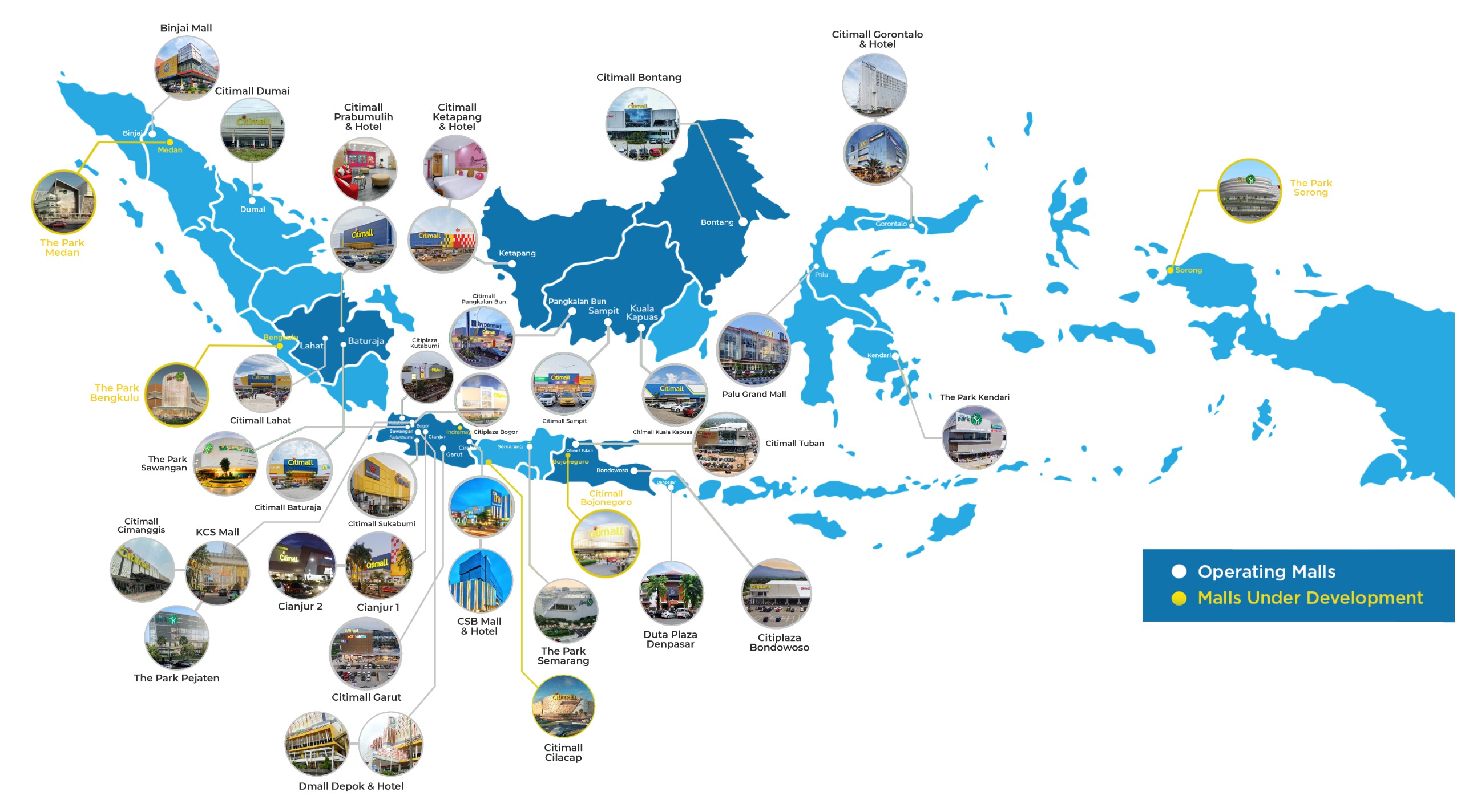 NWP Property memiliki eksistensi yang kuat dan terus tumbuh di berbagai wilayah di Indonesia. Pusat-pusat perbelanjaan kami dapat ditemukan di Kalimantan Barat, Kalimantan Tengah, Sumatra Selatan, Jawa Barat dan Jawa Tengah, sementara proyek-proyek akan datang mencakup beberapa wilayah, termasuk di Kalimantan, Sumatra, Jawa dan Sulawesi.